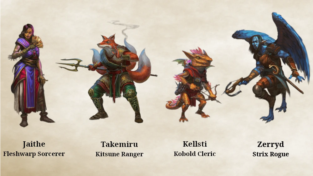 Use one of the pre-generated characters, or create your own level 4 character. Each player character starts out with an extra 15 gold pieces thanks to the advance payment, for a total of 30 gold pieces if you are creating your own.